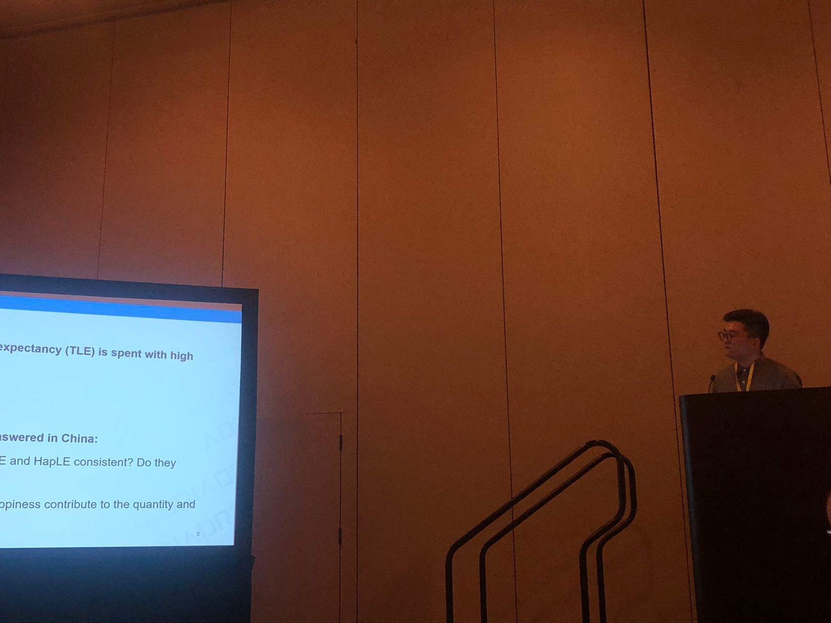 蒋耒文教授和研究生万云翔在分会场 Flash: Innovations in Measuring and Modeling Health and Health Determinant(健康和健康影响因素衡量和建模中的创新)展示了其合作撰写的文章“Toward Happiness, Health, and Longevity: A Multistate Analysis of Life Expectancy Among the Elderly in China(走向幸福、健康和长寿:中国老年人预期寿命的多状态分析)”并发表了相关演讲。该文章采用多状态生命表方法模拟老年人在健康、幸福和生存状态间的转换,检验老年人延长的寿命是否在健康和幸福中度过。在海报展示和讨论环节,与会学者围绕该文章主题和方法展开热烈讨论,并为文章的优化和进一步的研究发现提供了建议。